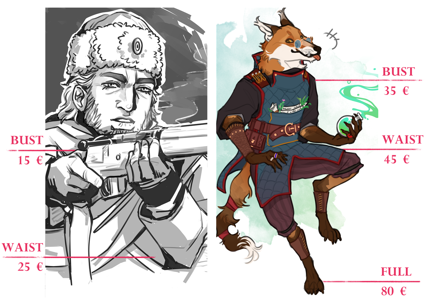 ~ 35β¬ is the starting price, but it may go up if the design of your character is complex or if you want a more ornamented background